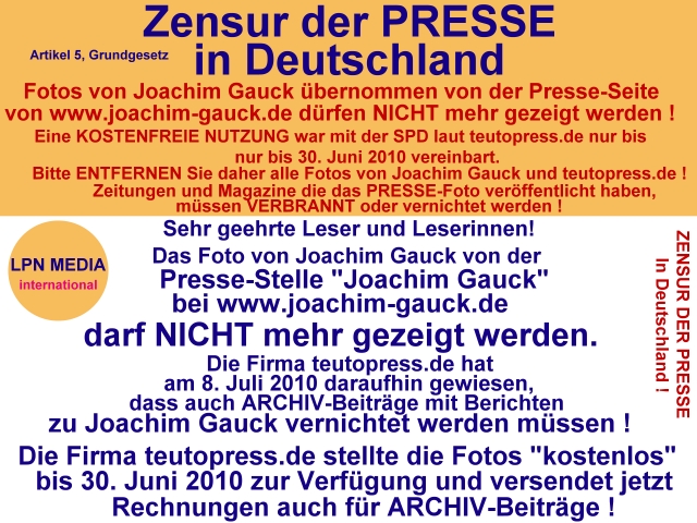 Zensur der Presse in Deutschland. Das Bild von Joachim Gauck wurde am 8. Juli 2010 entfernt. Die Firma teutopress.de versendet Rechnungen auch für Presse-Fotos in Archive-Betirägen, die vor dem 30. Juni 2010 veröffentlich wurden !