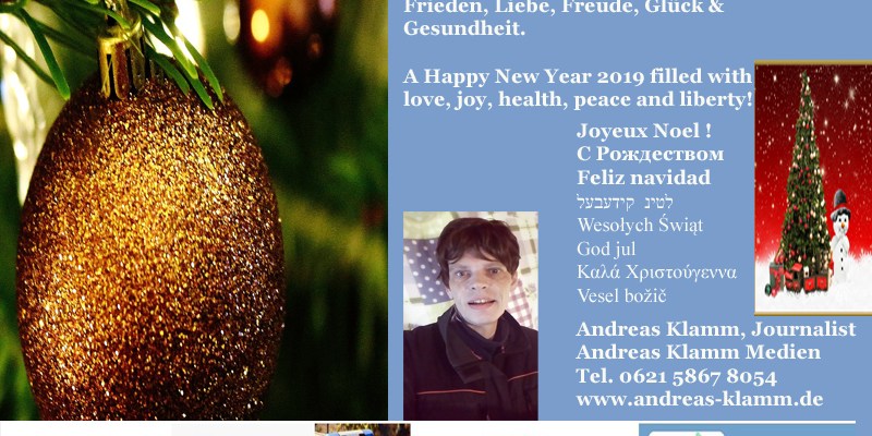 Frohe Weihnachten! Frohe Fest- und Feiertage! Merry Christmas! Season Greetings! Ein gutes Neues Jahr 2019 erfüllt mir Frieden, Sozialem, Demokratie, Freude, Liebe, Glück und Gesundheit! wünscht Andreas Klamm, Journalist, Radio TV IBS Liberty, Liberty and Peace NOW! Human Rights Reporters, Britishn Newsflash Magazine, Regionalhilfe.de, ISMOT International Social And Medical Outreach Team, Mittwoch – Liberte, Andreas Klamm Media, Tel. 0621 5867 8054, Tel. 030 57 700 592, www.regionalhilfe.de, www.ibstelevision.org, www.andreas-klamm.de
