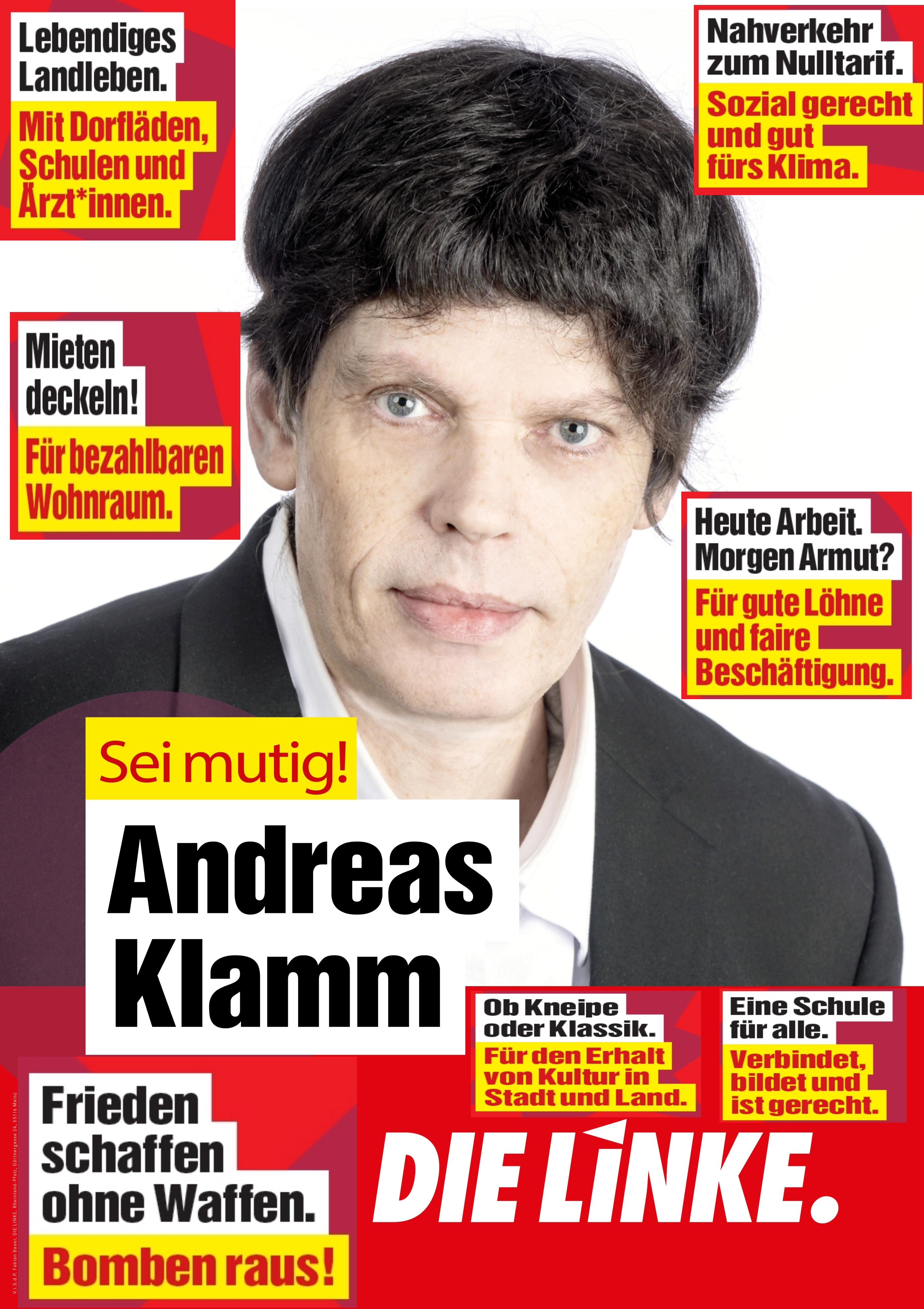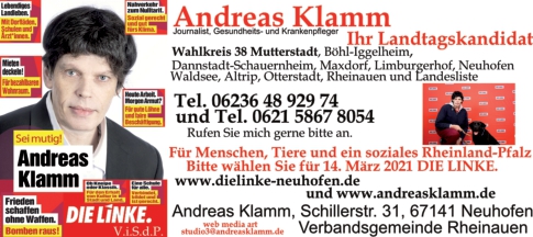 Ludwigshafen / Neuhofen / Mutterstadt. Andreas Klamm, Journalist, staatlich geprüfter Krankenpfleger und Rettungssanitäter kandidiert für die Partei DIE LINKE auf der Landesliste und als direkter Kandidat für den Wahlkreis 38 Mutterstadt, Böhli-Iggelheim, Dannstadt-Schauernheim, Maxdorf, Limburgerhof, Neuhofen, Waldsee, Otterstadt, Altrip und Rheinauen. In der Folge mehrerer Unfälle ist der Landtagskandidat schwerbehindert, auf die Hilfe eines Rollstuhls und einer Assistenz-Hündin angewiesen. Die Wahl-Info-Seite ist bei https://wahlkreis38.andreasklamm.de erreichbar.