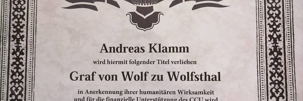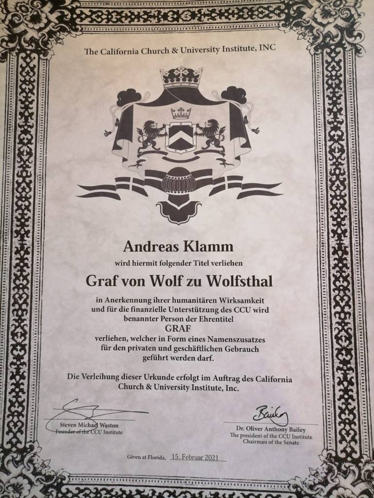 Ludwigshafen / Neuhofen/Verbandsgemeinde Rheinauen. (mid). Andreas Klamm, Journalist, Gesundheits- und Krankenpfleger, Rettungssanitäter, Moderator, Musik-und Medien-Produzent, Gründer von Regionalhilfe.de ISMOT International Social And Medical Outreach Team, IFN International Family Network d734, Liberty and Peace NOW! Human Rights Reporters darf als Andreas Klamm Graf von Wolf zu Wolfsthal auftreten. Den Ehren-Titel hat der Journalist, Moderator, Gesundheits- und Krankenpfleger Musik- und Medien-Produzent von der California Church & University Institute INC in Florida erhalten, teilt der 53jährige in Ludwigshafen am Rhein mit.