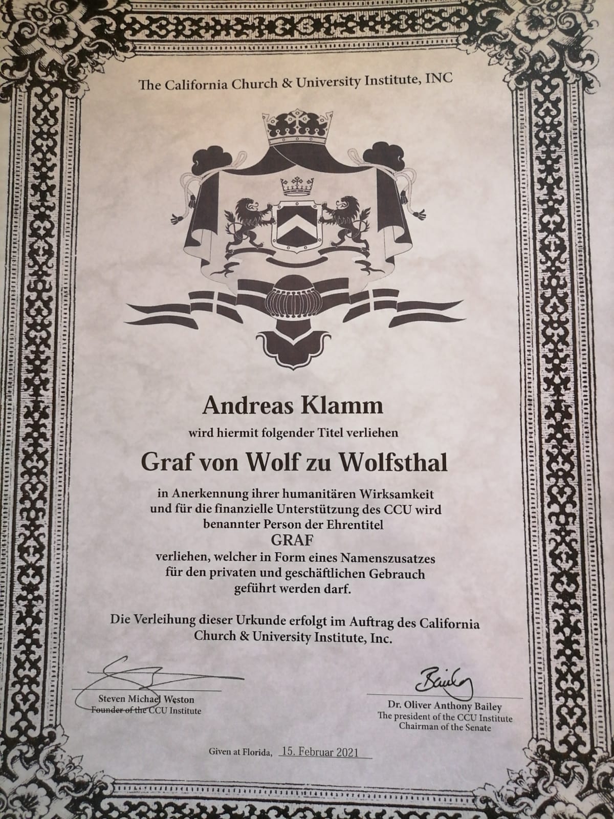 Foto der Urkunde für Andreas Klamm, der den Ehren-Titel Andreas Klamm, Graf von Wolf zu Wolfsthal erhalten hat. Foto: mid