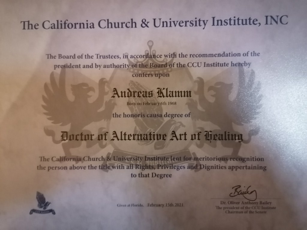 Doctor of Alternative Art of Healing von der California Church & University Institution INC, Florida fürAndreas Klamm. Foto: mid